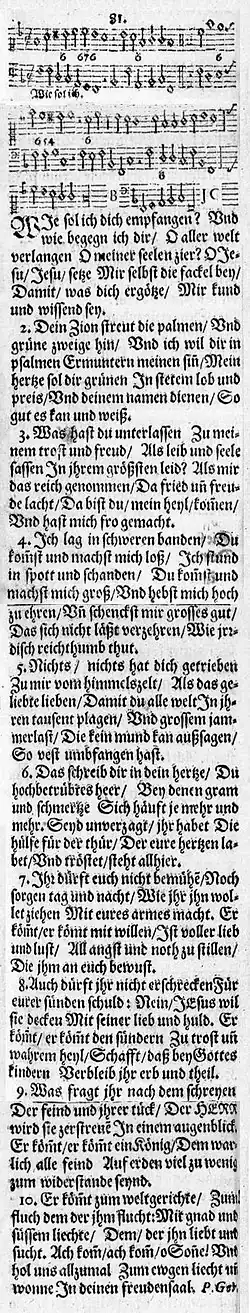 Das Lied Wie soll ich dich empfangen von Paul Gerhardt (1607–1676) erschien erstmals im Jahr 1653 in der fünften Auflage des Gesangbuchs Praxis Pietatis Melica[1] von Johann Crüger, der dazu auch die Melodie schuf.
