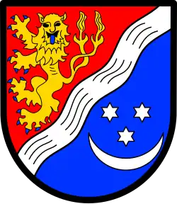 Blasonierung: „Durch einen silbernen Wellenbalken schräglinks geteilt; vorne in Rot ein blaubewehrter und -gezungter doppelschwänziger goldener Löwe, hinten eine liegende silberne Mondsichel überhöht von drei silbernen sechsstrahligen Sternen (2:1).“[6] |