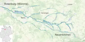 - ↑ Albrecht Greule: Deutsches Gewässernamenbuch. Walter de Gruyter, Berlin / Boston 2014, ISBN 978-3-11-057891-1, S. 590, „¹Wiedau“ (Auszug in der Google-Buchsuche).