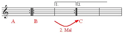 Für den Fall, dass nur ein Teil eines Stückes wiederholt werden soll, muss vor den ersten Takt des zu wiederholenden Teils ebenfalls ein (nach rechts gerichtetes) Wiederholungszeichen gesetzt werden. Voltenklammern (auch: Klammer, Haus) werden eingesetzt, wenn ein Takt oder mehrere am Ende des Wiederholungsteils nach erfolgter Wiederholung übersprungen bzw. durch einen abweichenden Takt ersetzt werden sollen. Somit ergibt sich für die folgende Notation ein klarer Ablauf:
