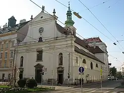 Ursprünglich stand auf dieser Höhe inmitten der Wiedner Hauptstraße die sogenannte Rauchfangkehrerkirche, der Vorgängerbau der heutigen Kirche. Sie wurde 1725 anstelle einer Kapelle im barocken Stil erbaut und 1783 zur Pfarrkirche erhoben. Nach langen Diskussionen beschloss man im 20. Jahrhundert, die Kirche, die für Autos ein Verkehrshindernis darstellte, abzureißen und stattdessen den heutigen Bau auf der linken Straßenseite zu errichten. Der Abriss erfolgte ab 30. August 1965 ungeachtet einer Protestwelle mit 13.000 Unterschriften.