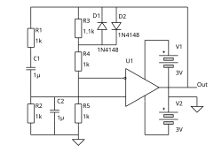 Die Amplitudenregelung kann im einfachsten Fall durch zwei antiparallel geschaltete Dioden D1 und D2 erfolgen. Der Widerstand R3 ist etwas größer als R4, so dass die Verstärkung etwas größer als 3 ist und die Schaltung anschwingt. Wenn die Spannung an R3 etwa 0,5 V erreicht, beginnt Strom durch die Dioden zu fließen; damit wird R3 scheinbar kleiner bzw. die Verstärkung herabgesetzt, bis die Schwingung gerade soeben aufrechterhalten wird. Mit den angegebenen Bauteilen ist die Frequenz 159 Hertz.