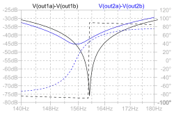 Im Bild sind zwei Frequenzgänge gezeigt: die trennscharfe Kurve (schwarz) für ideale Bauteile, die flache Kurve (blau), wenn R1 um 5 % erhöht ist: Schon kleine Toleranzen verschlechtern den Gütefaktor der Brückenschaltung in der Umgebung des Phasensprunges und verschieben die Frequenz.