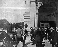 Eröffnung der Hygieneausstellung. Erzherzog Franz Salvator wird vor der Rotunde von Stadtrat Roderich Krenn begrüßt.
