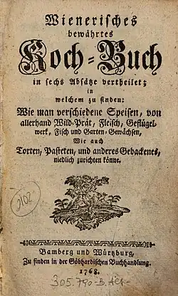 - Wienerisches bewährtes Koch-Buch in sechs Absätze vertheilet; in welchem zu finden: Wie man verschiedene Speisen, von allerhand Wild-Prät, Fleisch, Geflügelwerk, Fisch und Garten-Gewächsen, Wie auch Torten, Pasteten, und anderes Gebackenes, niedlich zurichten könne. Bamberg und Würzburg 1768.