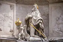 - in dem den Menschen vorbehaltenen Sockel, in dessen obersten Drittel Leopold I. als Fürbitter zu Gott betet,