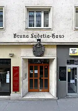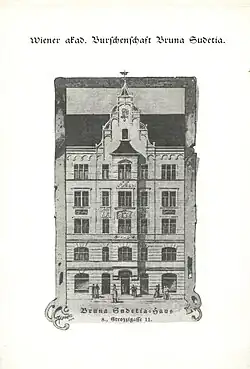 Am 20. November 1898 wurde von Alten Herren der Bruna Sudetia ein rechtlich selbstständiger Verein, die Wohnungsgenossenschaft Bruna Sudetia, mit dem Ziel gegründet, in Wien ein Haus zu errichten und in diesem den Aktiven ein Heim zur Verfügung zu stellen. Am 9. April 1899 erfolgte feierlich die Grundsteinlegung dieses Hauses in der Josefstadt, Strozzigasse 11.[14] Bereits am 18. November 1899 fand die festliche Einweihung des Hauses, als erstes Couleurhaus in Österreich, im Beisein des Rektors der Wiener Universität statt.