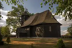 - Die römisch-katholische Schrotholzkirche Kreuzerhöhungskirche (poln. Kościół Podwyższenia Krzyża Świętego) wurde 1698 als evangelisches Gotteshaus erbaut. Nach Baufälligkeit zu Beginn des 20. Jahrhunderts wurde die Kirche teilweise abgebrochen und 1939 original wieder rekonstruiert.[9] Das Gotteshaus steht seit 1954 unter Denkmalschutz.[4]