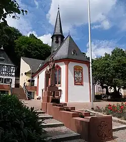 Gegenüber der Burgruine befindet sich ein kleiner Platz mit der katholischen Kirche St. Georg und Katharina mit spätgotischem Chor und Dachreiter (1509). Die 1953/54 erbaute neue Pfarrkirche stößt rechtwinklig dahinter an die alte Kirche und hat einen Teil der Ausstattung aufgenommen, zu der u. a. ein gotisches Kruzifix aus der Entstehungszeit der Kirche, ein barocker Hochaltar aus dem Kloster Tiefenthal (1713), eine aus dem Franziskanerkloster in Hadamar stammende Barockkanzel (1676) sowie die Statuen der Namenspatronen aus gleicher Epoche gehören. Bei einer Restaurierung 1989/90 kamen ein neuer Altartisch, Ambo und Osterleuchter von Hubert Elsässer dazu.