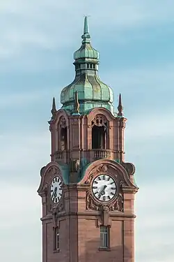 Außen besteht er aus rotem Sandstein und besitzt reiche neobarocke Formen. Höhepunkt ist ein seitlich (östlich) der Empfangshalle angeordneter 40 m hoher Uhrturm mit geschweifter Haube. Der westliche (ehemalige) Eingang wird überragt von einer kupfernen Kuppel. Das Dach wird mit grünen Ziegeln geschmückt.