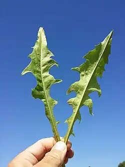 Der Stängel ist locker beblättert.[1] Die Laubblätter sind kahl oder zerstreut kurz behaart; die unteren sind keilig-länglich und gestielt; die oberen länglich bis lanzettlich mit verschmälertem, gestutztem oder schwach pfeilförmigem Grund sitzend, gezähnelt bis schrotsägeförmig-fiederspaltig oder fiederig zerschlitzt.[1] Die sitzenden Stängelblätter sind am Rand nicht „umgerollt“ und die „Sägezähne“ sind abwärts gerichtet.
