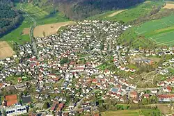 Oberdorf und Unterdorf blieben bis in die jüngere Vergangenheit sehr klein. 1749 wurden 21 Wohngebäude im Oberdorf und 13 Wohngebäude im Unterdorf gezählt. Erst ab 1900 sind die beiden Siedlungskerne, in denen es damals zusammen rund 100 Wohngebäude gab, zu einem geschlossenen Ortsbild zusammengewachsen. Als neuen Ortsmittelpunkt errichtete man 1901/02 zwischen den Siedlungskernen das Schul- und Rathaus, 1928/29 erschloss man die ebenfalls zwischen den Ortskernen gelegenen Deywiesen. Danach ist der Ort vor allem durch das Gewerbegebiet im Südwesten und durch Neubaugebiete im Nordwesten und Südosten noch stark angewachsen. 1970 gab es bereits über 300 Wohngebäude am Ort,[8] seitdem hat sich die Einwohnerzahl nochmals etwa verdoppelt.