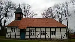 Die evangelische Kirche, ein kleiner rechteckiger Fachwerkbau mit Dachreiter, stammt aus der 1. Hälfte des 18. Jahrhunderts. Der Altaraufsatz ist aus derselben Zeit. Er enthält spätgotische Schnitzfiguren (Maria, Petrus, der Gekreuzigte).[1]
