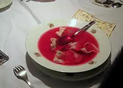 Ein Wigilia-Essen beinhaltet traditionell kein Fleisch, sondern folgende Gerichte: die Rote-Beete-Suppe Barszcz mit Uszka (Ravioli)[1], Pierogi mit Sauerkraut und Pilzen (pierogi z kapustą i grzybami).