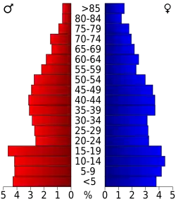 30,7 Prozent der Bevölkerung waren unter 18 Jahre alt, 9,1 Prozent zwischen 18 und 24, 25,5 Prozent zwischen 25 und 44, 21,0 Prozent zwischen 45 und 64 und 13,7 Prozent waren 65 Jahre oder älter. Das Durchschnittsalter betrug 34 Jahre. Auf 100 weibliche Personen kamen 87,2 männliche Personen und auf Frauen im Alter von 18 Jahren und darüber kamen 81 Männer.
