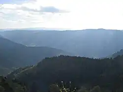 Die Wilde Gutach beim Austritt aus den Engtälern von Wildgutach in das breitere Simonswälder Tal (vorn) | ||