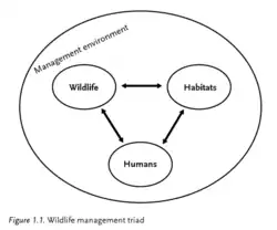 - ↑ Daniel J. Decker, Shawn J. Riley, William F. Siemer: Wildlife Management as a Process within a System. In: Daniel J. Decker, Shawn J. Riley, William F. Siemer (Hrsg.): Human Dimensions of Wildlife Management. 2. Auflage. Johns Hopkins University Press, Baltimore 2012, ISBN 978-1-4214-0654-1, S. 248 (eingeschränkte Vorschau in der Google-Buchsuche): „We then defined wildlife management as follows: The guidance of decision-making processes and implementation of practices to influence interactions among people, and between people, wildlife and wildlife habitats, to achieve impacts valued by stakeholders.“