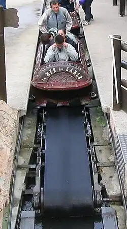 Auf der folgenden, bis zu 20 Meter hohen, Abfahrt rollen die Boote auf am Bootsboden angebrachten Rädern hinab. Erst unten angekommen fahren sie wieder geführt in eine Wasserrinne, wo sie durch den Wasserwiderstand abgebremst werden. Durch die auftretende Wasserverdrängung spritzt das Wasser teilweise hoch auf, auch die Fahrgäste können dabei nass werden. Dabei ist der Bug der Boote so geformt, dass möglichst viel Wasser von den Insassen ferngehalten wird und eine optimale, nicht zu abrupt einsetzende Bremswirkung vorhanden ist. Zur Führung in der Rinne sind weitere Räder in horizontaler Laufrichtung unten seitlich montiert.