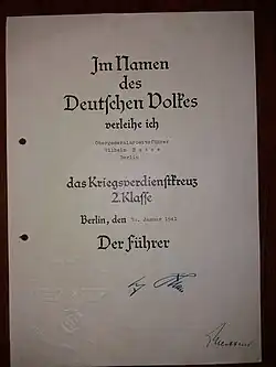 - Kriegsverdienstkreuz 2. Klasse (30. Januar 1941)