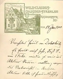 Seine Korrespondenz erledigte er mit von ihm entsprechend illustriertem Briefpapier, so auch am 13. Januar 1900 an seine Schülerin Erna von Dobschütz, die sich sowohl bei ihm als auch bei Robert Sterl angemeldet hatte (siehe Foto).