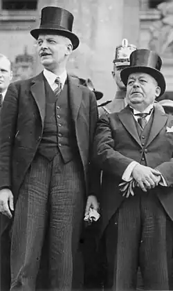 Nach dem Rücktritt des Reichskanzlers Joseph Wirth am 14. November 1922 bildete Cuno ein der politischen Mitte zuzuordnendes „Kabinett der Wirtschaft“, das von einer parlamentarischen Minderheit aus Zentrumspartei, Deutscher Demokratischer Partei, Deutscher Volkspartei und Bayerischer Volkspartei gestützt wurde.[2] Am 22. November 1922 wurde er von Reichspräsident Friedrich Ebert zum Reichskanzler ernannt.[3] Dieser Schritt erfolgte ohne parlamentarische Absprache oder Wahl, weshalb man ihn als den ersten Präsidialkanzler betrachtet.[4] Mit diesem Schritt wollte Ebert mehrere Ziele erreichen: Die parteiliche Ungebundenheit Cunos sollte die politischen Wogen glätten und gleichzeitig die Finanzkrise des Reiches überwinden. Darüber hinaus verfügte der neue Kanzler über einflussreiche Kontakte in die USA, die die Lösung der Reparationsfrage begünstigen sollten.