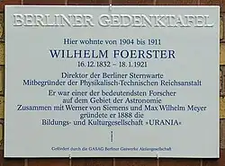 - ↑ Wilhelm Foerster: Ansprache zum 25-jährigen Jubiläum der Gesellschaft URANIA in Berlin. In: Himmel und Erde, 1913, (25), S. 386.
