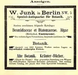 Als Antiquar galt Wilhelm Junks Interesse vor allem seltenen naturkundlichen Werken, insbesondere der Botanik und der Insektenkunde. Als Verleger gab er Tafelwerke und Kataloge zu diesen Bereichen heraus. Von 1901 bis 1935 erschienen in seinem Verlag Neudrucke seltener alter Schriften zur Naturkunde, darunter zum Beispiel 1925 die Hispanische Reise-Beschreibung de anno 1671 des Friederich Martens.