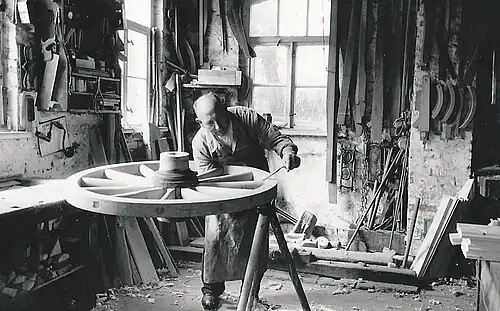 Das Bild zeigt ihn in seiner Werkstatt bei der Arbeit. Immer dabei waren unter seiner Hobelbank oder in der Tasche seiner Arbeitsschürze ein Notizheft oder ein Bestell- oder Rechnungsblock, in die er mit Füllhalter oder auch mit dem Tischlerbleistift in schöner Sütterlinschrift Verse und Gedanken eintrug, die ihm bei der Arbeit kamen.