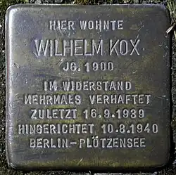 Wilhelm Kox (* 8. November 1900 in Aachen; † 10. August 1940 in Plötzensee, Berlin) (Decknamen: Schenk, Stegmann, Rudolf) war ein deutscher kommunistischer Funktionär und Opfer der NS-Justiz.
