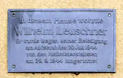 Ihr wesentliches Ziel, nämlich die Beugung der Persönlichkeit, erreichten die Nationalsozialisten jedoch nicht. Schon bald nachdem Leuschner im Juni 1934 aus dem Konzentrationslager entlassen worden war, begann er mit dem Aufbau eines reichsweiten Widerstandsnetzwerks. Er übernahm 1936 von Ernst Schneppenhorst die Leitung einer kleinen Fabrikationsstätte zur Produktion von Bierschankutensilien, die bald zur Schaltzentrale der illegalen Reichsleitung der deutschen Gewerkschaften wurde. In dieser Zeit wurde Hermann Maaß einer seiner engsten Mitarbeiter. Leuschner engagierte sich nicht nur in gewerkschaftsnahen Widerstandsstrukturen, sondern unterhielt u. a. auch konspirative Kontakte zur linkssozialistischen Widerstandsgruppe Roter Stoßtrupp und dessen Berliner Anführer ab 1934 Kurt Megelin. Dessen Ehefrau Else Megelin wurde von Leuschner zu Tarnzwecken als Sekretärin in seiner Kreuzberger Firma beschäftigt. Leuschner und der Rote Stoßtrupp unterhielten auch Verbindungen zum Kreisauer Kreis und ab 1939/40 zur Widerstandsgruppe von Carl Friedrich Goerdeler.[13] Innerhalb dieses heterogenen Kreises galt Leuschner als Repräsentant der Gewerkschaften, also als Garant einer antinazistischen Massenbasis, und zugleich als aktiver Streiter gegen die Etablierung einer ständestaatlichen Ordnung nach der angestrebten Überwindung des nationalsozialistischen Regimes. Nach dem geplanten Putsch gegen Hitler sollte Leuschner im Schattenkabinett Beck/Goerdeler möglicherweise Vizekanzler werden; der Nationalkonservative Graf von Stauffenberg, der das Attentat auf Hitler durchführte, soll persönlich sogar Leuschner gegenüber Goerdeler als Kanzler favorisiert haben.[14] Das Attentat vom 20. Juli 1944 und der Umsturzversuch scheiterten jedoch. Leuschner fiel am 16. August 1944 einer Denunziation zum Opfer und wurde festgenommen. Er wurde sodann vom Volksgerichtshof unter dem Vorsitz von Roland Freisler zum Tode verurteilt.[15] Am 29. September 1944 wurde Wilhelm Leuschner im Strafgefängnis Berlin-Plötzensee durch Erhängen hingerichtet.[16]