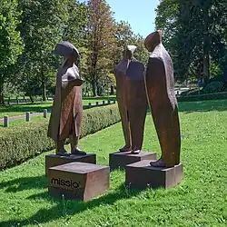 - Drei lebensgroße, rot lackierte Figuren auf quadratischen Sockeln stehend; ein vierter freier Sockel mit der Aufschrift: "missio/glauben.leben.geben" lädt symbolisch zum Gespräch ein