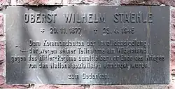 - Dem Kommandanten der Invalidensiedlung, der wegen seiner Teilnahme am Widerstand gegen das Hitler-Regime unmittelbar vor Ende des Krieges von den Nationalsozialisten ermordet wurde, zum Gedenken.