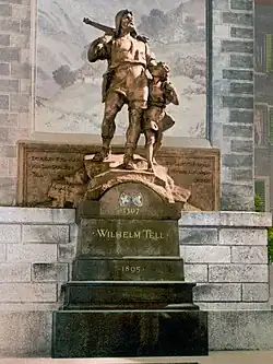 Darstellungen nach 1804 sind stark von Schillers Drama beeinflusst. In der Nationalromantik wird Tell nun oft in der Tracht eines Alphirten dargestellt. Vincenzo Vela schuf 1856 das Telldenkmal in Lugano, das ihn mit einem Pfeil in der Rechten zeigt, den er drohend emporhält. Ernst Stückelberg gestaltete 1879 ein Fresko mit der Szene von Tells Sprung auf die Tellsplatte für die dortige Tellskapelle. Besonders bekannt ist das Telldenkmal von Richard Kissling in Altdorf (1895). Einflussreich war auch das Gemälde von Ferdinand Hodler (1897), eigentlich eine Studie für ein grösseres Werk Gesslers Tod, das Hodler für den Wettbewerb des Landesmuseums plante. Hodlers Darstellung von Tell wurde als «sakral» beschrieben und mit der klassischen Ikonographie von Gottvater, Moses, Johannes des Täufers oder Jesus verglichen.[21] Für das Landesmuseum in Zürich schuf Hans Sandreuter 1901 ein Mosaik, das die Szene der Verhaftung Tells durch Gesslers Schergen zeigt.