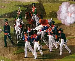 - ↑ 1806/07: Schlacht bei Pułtusk, Belagerung von Wrocław (Breslau), Übergabe von Brzeg (Brieg), Erstürmung des Lagers bei Kłodzko (Glatz), Belagerung von Koźle (Cosel); 1809: Gefecht bei Arnhofen, Schlacht bei Eggmühl, Schlacht bei Wagram; 1812: Schlacht bei Polozk; 1813: Schlacht bei Hanau; 1814: Schlacht bei Brienne, Schlacht bei Bar-sur-Aube. Jedes Gemälde wurde mit 1000 Gulden bezahlt.