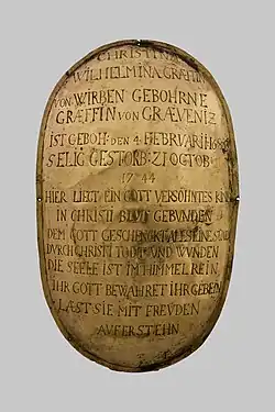 Christina Wilhelmine von Würben starb am 21. Oktober 1744 und wurde im Gewölbe der Berliner Nikolaikirche bestattet. Bei Grabungsarbeiten anlässlich der Restaurierung der Kirche 1879 wurde aus dem Schutt ihre vergoldete Sargtafel geborgen. Die Inschrift lautet: „Christina / Wilhelmina Gräffin / von Wirben gebohrne / Gräffin von Gräveniz / ist geboh:[ren] den 4. Februarii 1685 / selig gestorb:[en] 21 Octob: / 1744 / Hier liegt ein Gott versöhntes Kind / in Christi Blut gebunden / Dem Gott geschenckt all seine Sünd / Durch Christi Todt und Wunden / Die Seele ist im Himmel rein / Ihr Gott bewahret ihr Gebein / Läst sie mit Freuden / auferstehn.“[42]