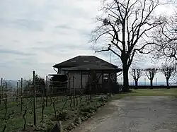 Die Hangkante selbst ist durch eine hohe Terrassenmauer gesichert, wodurch ein größerer Gästegarten entsteht. Auf dieser Fläche stehen das Hauptgebäude des Gasthauses sowie der Saalbau, beide heute unter Denkmalschutz.[1]