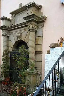Nachdem die lutherische Gemeinde als Gotteshaus 1632 zunächst die Kirche St. Nikolaus besaß, musste sie um 1635 dort wieder weichen. Ludwig Philipp von Pfalz-Simmern (1602–1655, reg. 1632–1649), der reformierte Administrator der Kurpfalz, ließ ihren Pfarrer Dolbier 1637 gefangen wegführen.[12][13] Die Gemeinde erhielt jedoch mit Unterstützung der lutherischen Rheingrafen als Kirche die alte rheingräfliche Zehntscheune neben dem Simmerner Hof[A 5], dem Stadtschloss der Pfalzgrafen in Kreuznach (heute: Jahnhallenparkplatz Hochstraße 27).[9] Wild- und Rheingraf Adolf Heinrich von Salm-Dhaun (1557–1606) hatte 1575 einen neuen „Rheingräflichen Hof“ (später: Städtisches Spital) in der Mühlenstraße erbaut.[14] Das Barockportal der alten lutherischen Kirche, die etwas länger als 60 Jahre in Gebrauch war, wurde später in einen Hof in der Hochstraße 25 eingebaut und ist noch erhalten.