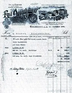 - ↑ a b Schrenk, Weckbach: „… für Ihre Rechnung und Gefahr“. Rechnungen und Briefköpfe Heilbronner Firmen. S. 86 (Emil Oppenheimer & Co. - Rechnung ausgestellt am 24. September 1908.)