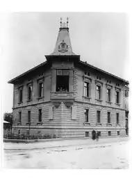Das 1894/95 erbaute Wohnhaus Wilhelmstraße 26[3] war ein Eckhaus an der Ecke Wilhelm- /Luisenstraße in Heilbronn. Über einem Sockelgeschoss erhoben sich zwei Geschosse, die nach oben mit einem niedrigen Mezzaningeschoß abschlossen. Zwischen Erdgeschoss und Obergeschoss befand sich ein Mäanderfries. Die Fassade zur Wilhelmstraße war in vier Achsen untergliedert, während die an der Luisenstraße in drei Achsen unterteilt gewesen ist. Die Eckansicht des Gebäudes erfuhr eine Betonung durch einen architektonisch aufwendig gegliederten Konsolerker. Der Erker war mit einem hohen Turmhelm versehen und verlieh der Eckansicht das Hauptaugenmerk. Pilaster mit ionischen Kapitellen und Voluten schmückten den Erker und stützten einen hohen, reich verzierten Architrav, auf dem der hohe Turmhelm ruhte. Die Fensterrahmung in der Beletage (1. Obergeschoss) war aufwändig gestaltet, mit Baluster in den Brüstungsfeldern und Fensterverdachungen auf Konsolen.