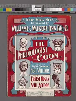 - The phrenologist coon, Text: Ernest Hogan (1865–1909), Incipit: Of all the men of history, publiziert bei Jos. W. Stern & Co. in New York, 1901[30] Bert Williams sang das Lied und machte es in seinen Shows bekannt und spielte es am 11. Oktober 1901 bei der Victor Talking Machine Company ein. Eine weiter Einspielung des Songs folgte am 15. Januar 1903 von Silas Leachman (1859–1936) bei Victor.[Digitalisat 3]