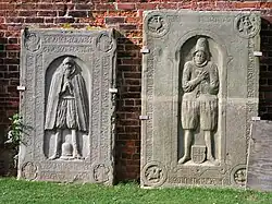 An der Wand des Glockenturm und in der Kirche sind mehrere Grabplatten aus dem 16./17. Jahrhundert aufgestellt, die früher Gräber in der Kirche abgedeckten. Einige von ihnen zeigen die unter ihnen beigesetzten Männer in zeitgenössischer Tracht.
