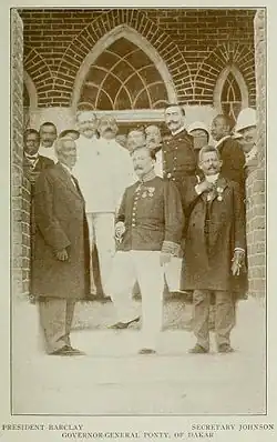 William Ponty folgte Roume am 18. Februar 1908 als Generalgouverneur von Französisch-Westafrika nach, was er bis zu seinem Tod am 13. Juni 1915 bleiben sollte.[1] Zu den Schwerpunkten seiner Tätigkeit zählte der Aufbau von Bildungseinrichtungen und die Weiterentwicklung der Selbstverwaltung der einheimischen Bevölkerung. Die traditionellen Herrscher, Untergebene der Kolonialverwaltung, sollten von den Gemeinschaften bestimmt werden, die sie anführten.[6] Von Bedeutung ist in diesem Zusammenhang sein Rundschreiben vom 22. September 1909, in dem er seine politique des races als neue, für Frankreich förderliche Form der politischen Verwaltung in Französisch-Westafrika darlegte. Von ähnlichen Überlegungen getragen war seine Justizreform von 1912, mit der die einheimische Bevölkerung insbesondere in privatrechtlichen Angelegenheiten ein ihren Gebräuchen entsprechendes Gerichtswesen verordnet bekam.[7]