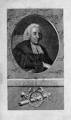 Er wurde Royal Chaplain von George III (1761), Principal of the University of Edinburgh (1762), Moderator der Church of Scotland 1763 und Royal Historiographer 1764 und belebte damit eine Rolle im königlichen Haushalt in Schottland neu, die von 1709 bis 1763 unbesetzt gewesen war. Robertson war auch Mitglied des Poker Club.[1] Seine bemerkenswerteste Arbeit war vielleicht die History of Scotland 1542–1603 welche 1759 veröffentlicht wurde. Er war eine signifikante Figur des Scottish Enlightenment.