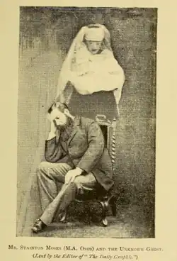 Moses war ein sehr frühes Mitglied der Society for Psychical Research (SPR). 1886 und 1887 veröffentlichte der SPR eine Reihe von Publikationen, in denen sie die Betrügereien des angeblichen Mediums William Eglinton offenlegten. Daraufhin verließen viele frühe Mitglieder, unter anderem auch William Stainton Moses, den SPR.[1] Seine Haltung gegenüber anderen schon aufgedeckten Betrügereien wurde auch dadurch deutlich, dass er die „Geisterfotografie“ von Edouard Isidore Buguet weiterhin unterstützte, obwohl dieser schon als Betrüger entlarvt war.[2]