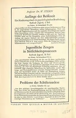 Neuausgabe: Darmstadt: Wissenschaftliche Buchgesellschaft, Leipzig 1993. - Die Intelligenz der Kinder und Jugendlichen und die Methoden ihrer Untersuchung. An Stelle einer dritten Auflage des Buches: Die Intelligenzprüfung an Kindern und Jugendlichen. Verlag von Johann Ambrosius Barth, Leipzig 1920