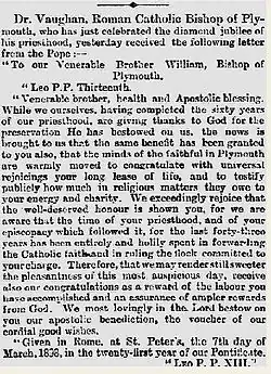 Als Vaughan sein Amt antrat, gab es im Bistum Plymouth 23 Missionen und 23 Priester. Als er 1902 starb, gab es 100 Priester, 13 männliche und 28 weibliche Klöster, vier Waisenhäuser, 27 Grund- und fünf weiterführende Schulen.