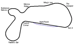 Nach der langen, ebenen Startziel-Gerade, auf der die Höchstgeschwindigkeiten erreicht werden, führt die 90° Linkskurve „Castol Corner“ zur „Rabbits Ear“ 180° Rechtskehre, die dem Kurs dem im Film „Herbie“ benutzten Spitznamen “Jack Rabbit Raceway” gab.[3] Über das „Omega“ erreicht man am „Balcony“ die höchste Stelle der Strecke, von wo es über die 90° Links-Kurve des Turn 5, die „Monroe Ridge“, den „Wings Leg“-Knick und den Sweeper zurück in die schwierigste Kurve, die ultraschnelle Turn 9 an die tiefste Stelle des Kurses zurück auf Start-Ziel geht.