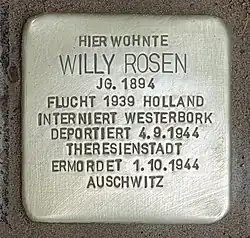 Nach der deutschen Besetzung der Niederlande wurde das Theater 1942 verboten. Sein Freund Kurt Robitschek organisierte in New York Solidaritätskonzerte für Rosen und sammelte Geld für eine Überfahrt Rosens in die USA. Die Flucht aus Europa gelang jedoch nicht mehr. Rosen wurde im Durchgangslager Westerbork inhaftiert, wo er an den von Max Ehrlich gestalteten Theaterabenden mitwirkte.[3] Anfang September 1944 kam er nach Theresienstadt in die „Magdeburger Kaserne“. Am 29. September wurde Willy Rosen in das NS-Vernichtungslager Auschwitz deportiert, verstarb vermutlich auf dem Weg dorthin, und wurde zum 1. Oktober 1944 für tot erklärt.[4]