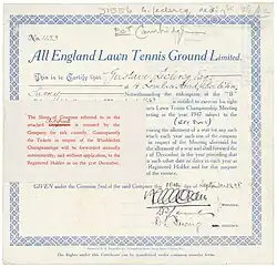 Seit 1920 werden zinslose Wimbledon-Anleihen (englisch debentures) an Tennisfans verkauft, um Mittel für Investitionsausgaben zu beschaffen. Alle fünf Jahre erfolgt die Ausgabe einer neuen Anleihe mit einer Laufzeit von ebenfalls fünf Jahren, wobei die Ausgabe jeweils zwei Jahre vor dem ersten Jahr des Ausgabezeitraums stattfindet. Es gibt eigene Debentures für den Centre Court und auch eigene Debentures nur für Court No.1. Die Höhe des einzuzahlenden Betrags für die Centre Court Debentures 2026–2030 beträgt 116.000 £ (ca. 137.600 €). Insgesamt gibt es 2.500 Debentures für den Centre Court und 1.250 für Court No.1, für den das Debenture 73.000 £ (ca. 86.000 €) beträgt. Sie berechtigen entsprechend zum Zugang zum Centre Court oder zu Court Nr. 1 sowie in beiden Fällen zum Zugang zu exklusiven Restaurants. Mit jeder einzelnen Anleihe wird für fünf Jahre jeweils eine Eintrittskarte für jeden Tag erworben. So konnten bis April 2024 Debentures für den Zeitraum 2026–2030 erworben werden. Sie werden am Ende des fünften Jahres zum Nennwert zurückgezahlt. Aber auch während der Laufzeit der Anleihe werden sie und die damit verbundenen Eintrittskarten über spezielle Broker gehandelt beziehungsweise ersteigert.[66]