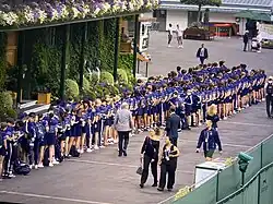Die Balljungen und -mädchen haben die Vorgabe, dass sie möglichst unauffällig agieren. Sechs sechsköpfige Teams werden ausgewählt, um für die Center- und No.1-Courts verantwortlich zu sein, sechs Sechserteams rotieren auf den anderen Tennisplätzen. Üblicherweise sind sie eine Stunde im Einsatz, gefolgt von einer einstündigen Pause. Im Laufe des Turniers reduziert sich sukzessive die Anzahl der Balljungen und Ballmädchen auf 80, da immer weniger Matches ausgetragen werden. Der durchschnittliche Verdienst von Balljungen und -mädchen, die in Wimbledon arbeiten, beträgt etwa 200 £ (234 €) pro Woche. In einem typischen Jahr sind rund 250 Balljungen und -mädchen im Einsatz, deren Durchschnittsalter 15 Jahre beträgt.[65] Seit 2006 tragen Funktionäre, Balljungen und Ballmädchen neue marineblaue und cremefarbene Uniformen des Unternehmens Ralph Lauren Corporation des amerikanischen Modedesigners Ralph Lauren.
